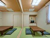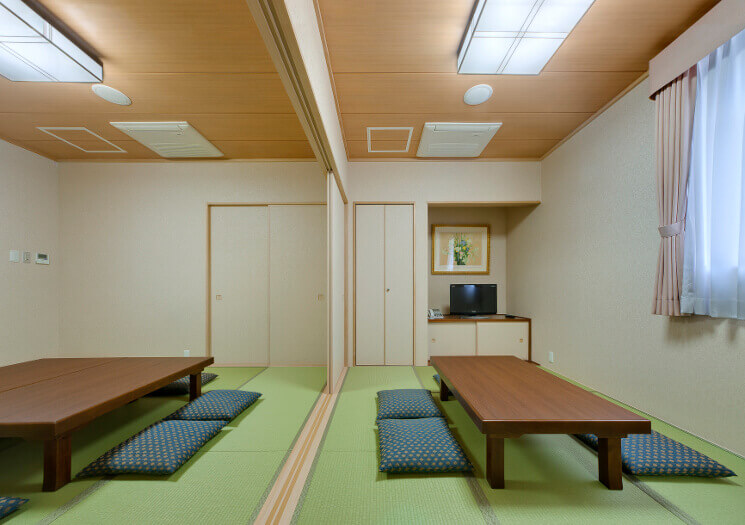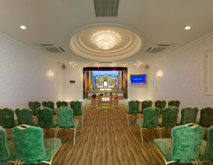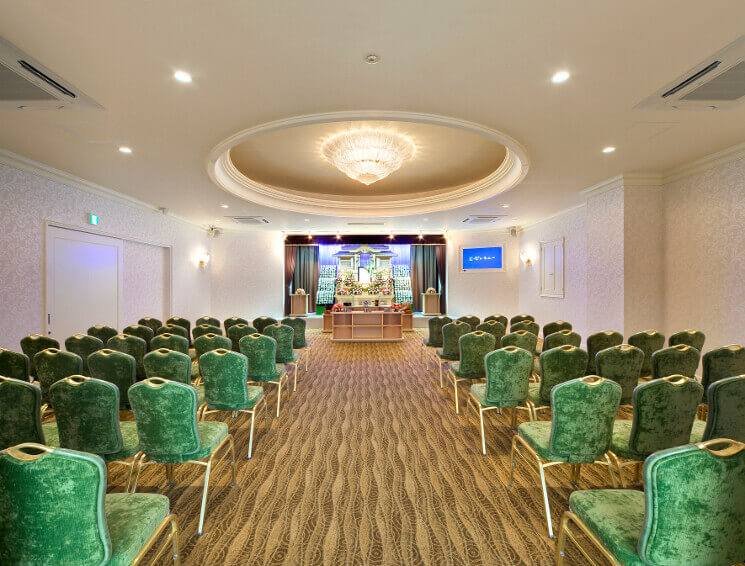 ご葬儀では仏式、神式、キリスト式、友人葬、無宗教葬、社葬、合同葬、音楽葬、家族葬、火葬式などあらゆる形式に対応しております。4階式場、5階式場と2つの葬儀式場を用意してございます。4階は大式場となり最大200名程度のご会葬者様に対応いたします。5階は最大50名のご会葬者に対応可能な小式場となって家族葬をご希望のお客様にご利用し易いように設計されております。各式場には遺族控え室をご用意しており仮眠をお取りになる事も可能でございます。